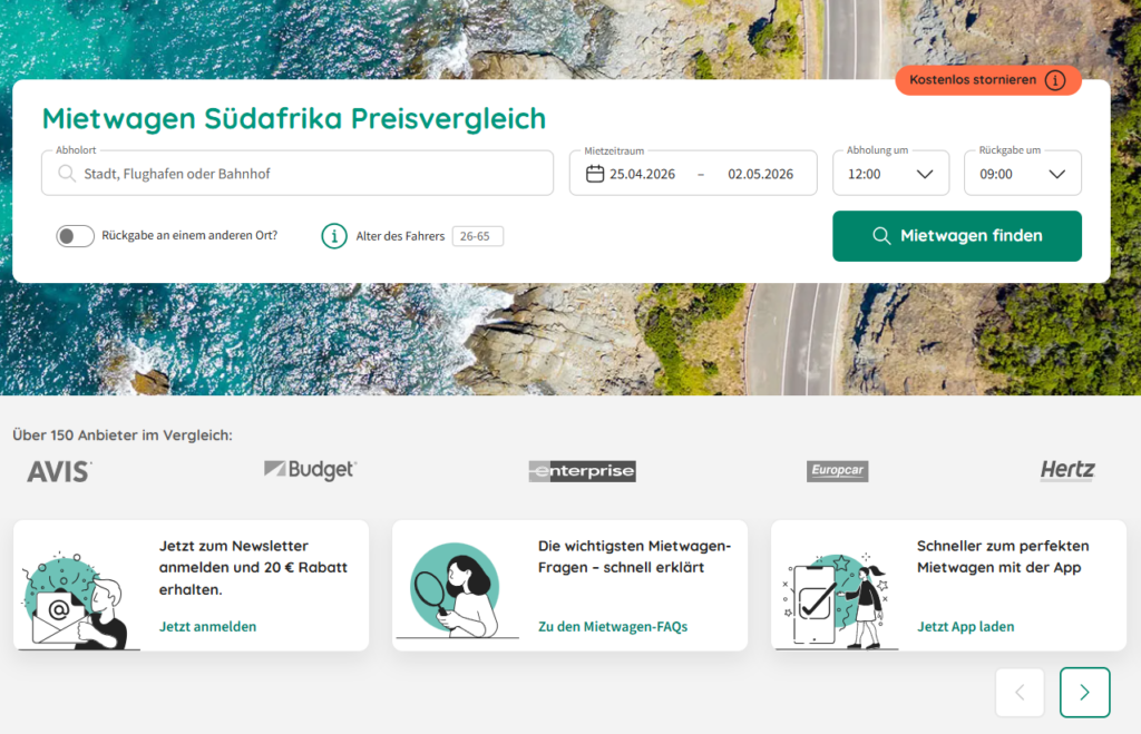- Beste Reisezeit: Die meisten Reisenden entscheiden sich für Dezember und Januar. Das ist auch dein Plan? Dann buche so früh wie es geht, um einen möglichst günstigen Mietwagen für Südafrika zu erwischen!