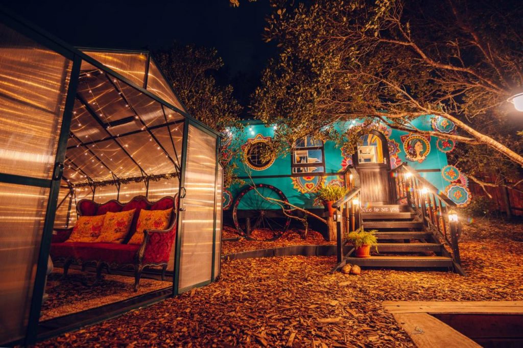Es gibt zwei Zigeunerwagen mit zwei Schlafplätzen. Jeder Wagen ist mit einem Queensize-Bett, einem eigenen Bad, einer Selbstversorgerküche, Wi-Fi sowie Sonnenliegen, Schaukeln und einem privaten, beleuchteten Gewächshaus mit Grillmöglichkeit ausgestattet. Es gibt nicht nur ein gemeinsames, herzförmiges Tauchbecken und eine Sauna mit heißen Steinen, sondern es können auch private Abendessen arrangiert werden, die im „Liebestunnel“ serviert werden – Deine bessere Hälfte wird hin und weg sein!