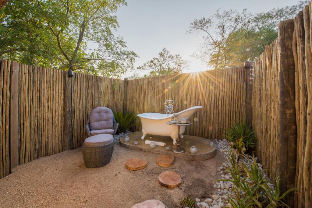 Geräumige Chalets mit eigenem Pool, Außendusche unter freiem Himmel, Gourmetmenüs am Abend und Massagen nach der Safari.