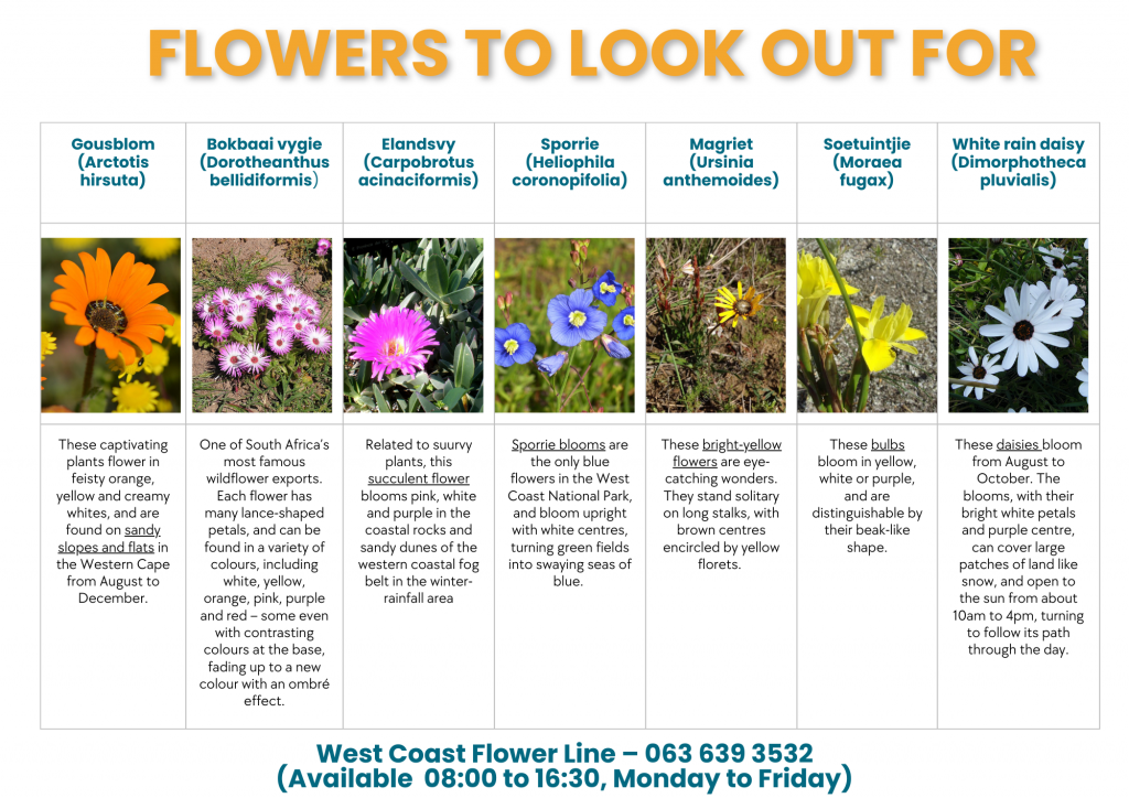 – Denken daran, Insektenschutzmittel, eine Sonnenbrille, geschlossene Wanderschuhe, Sonnencreme, einen Sonnenhut und einen Picknickkorb mitzunehmen. Denke daran, dass du das Veld mit verschiedenen Insekten teilst, die eine wichtige Rolle für das Überleben der Blumen spielen. Sei auch vorsichtig bei Schlangen.