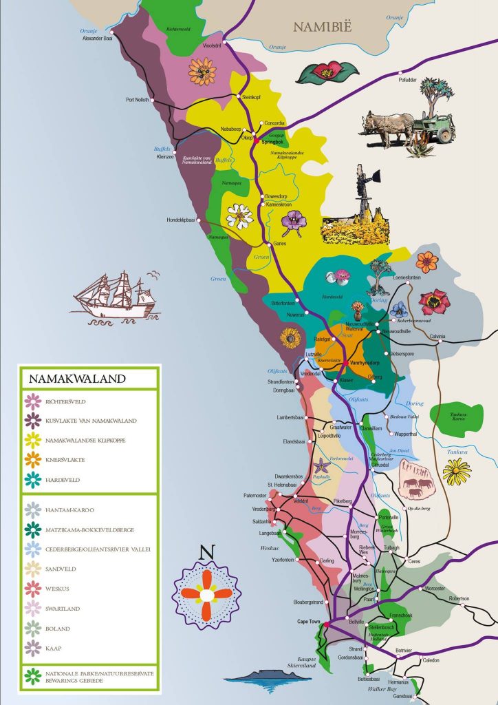 Diese weltberühmte Region erstreckt sich vom Oranje-Fluss im Norden bis nach Garies im Süden und vom Atlantischen Ozean landeinwärts in Richtung Pofadder. Städte wie Springbok, Kamieskroon, Port Nolloth und Hondeklipbaai sind allesamt beliebte Blühorte. Mit mehr als 3.500 Wildblumenarten – und über 60 % davon nirgendwo sonst auf der Welt – ist das Namaqualand eine der reichsten Wildblumenregionen der Erde.