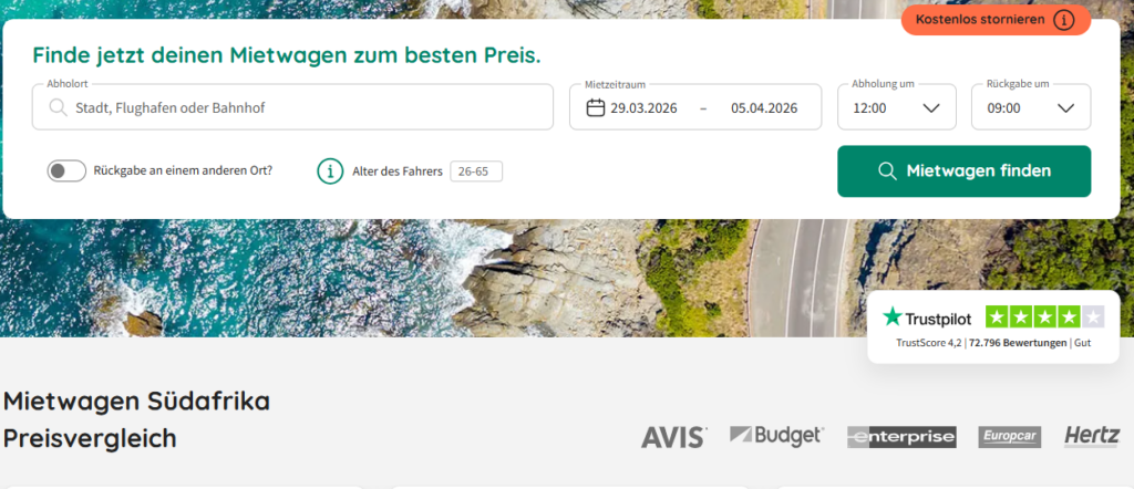 CHECK24 ist eines der bekanntesten Vergleichsportale in Deutschland und bietet dir eine große Auswahl an Mietwagenanbietern weltweit – auch in Johannesburg. Der Vorteil: Du kannst Preise, Leistungen und Bewertungen ganz einfach vergleichen und so den passenden Mietwagen Johannesburg für deine Bedürfnisse finden.